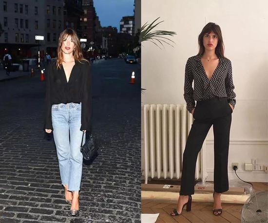 法式时髦从来都注重细节,不追求夸张华丽的色彩搭配,也不追求繁复的元素花样,而是专注在剪裁和面料上。衬衣尤其如此,每一件看似普通的衬衣都不会平淡,而法国女人最爱的就是大V领的衬衣穿法,脖子间的黑色丝巾或是随意解开的扣子,在不经意间散发优雅和性感的魅力。