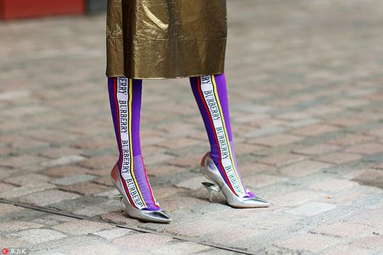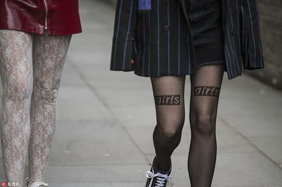 更为难驾驭的肉色丝袜同样能够用字母加持,只不过密度过大的slogan印花是对腿部的考验。