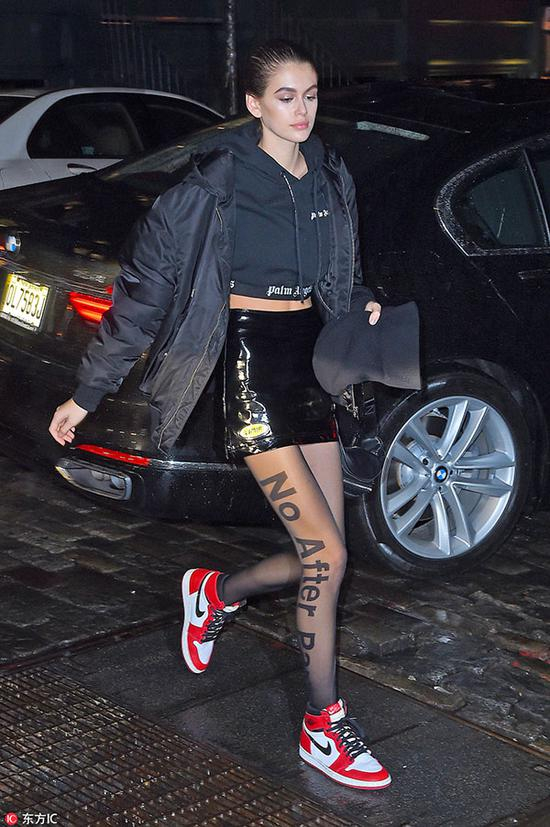 Kaia Gerber 近日穿黑丝出街,不同于印象中的黑丝样式,这条slogan印花丝袜平添休闲感,不仅没有一般黑丝的性感反而有种率性的酷劲儿。
