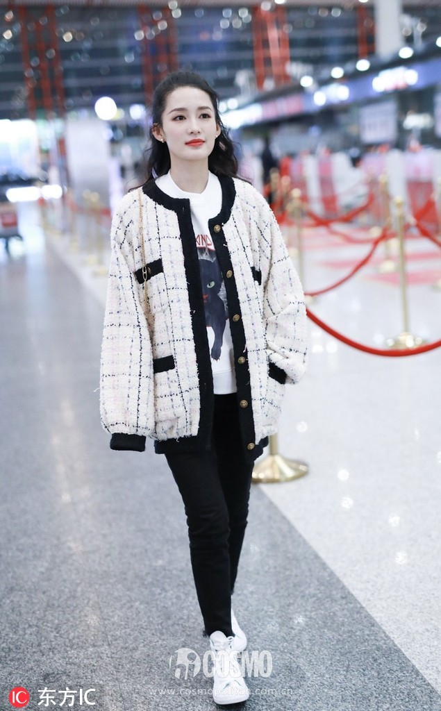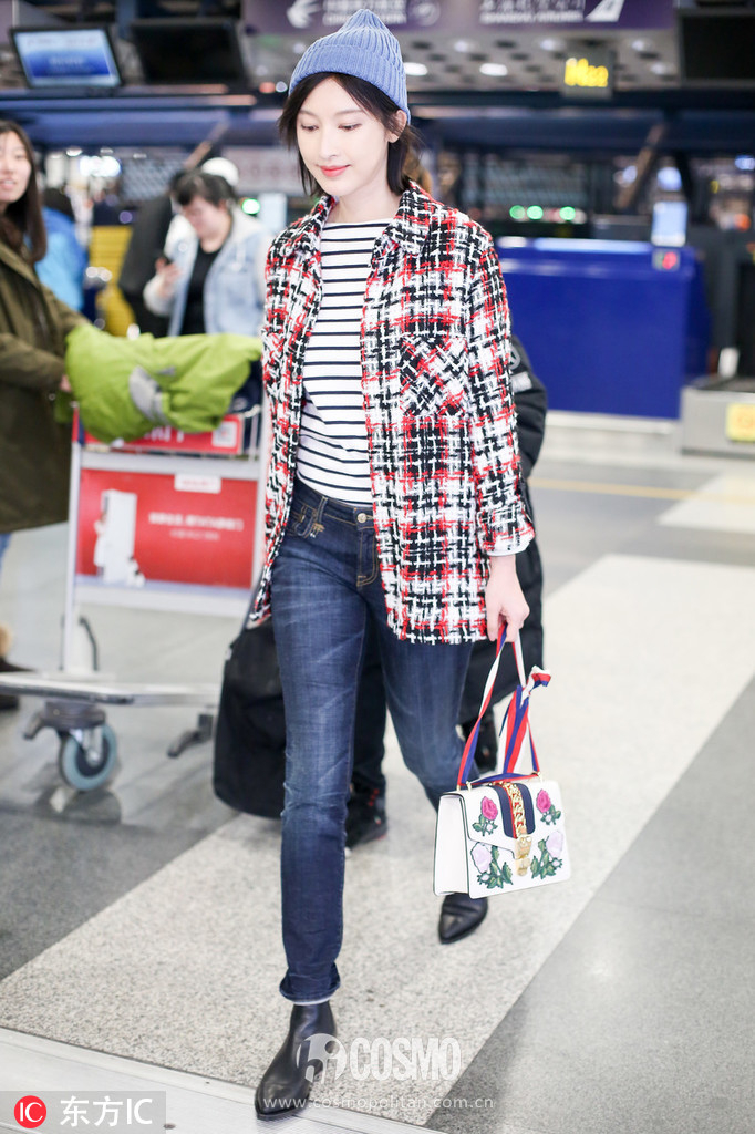 张俪在机场街拍中穿的这款红色系斜纹软呢外套青春气十足,具有衬衫的版型和款式,内搭一件黑白条纹tee,就很减龄。她下身搭配一条深蓝色紧身牛仔裤,利落又率性,整体LOOK的搭配十分协调。