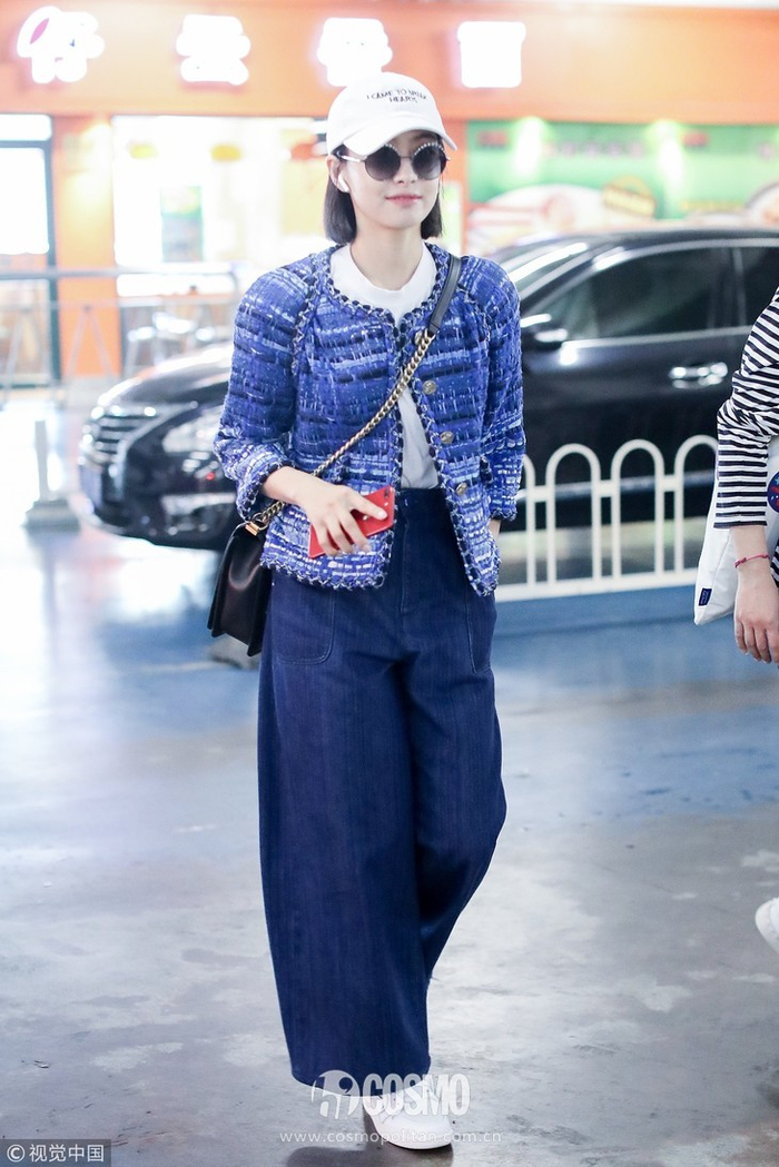 宋茜用短款的Chanel深蓝色粗花呢外套搭配同色系Chanel深蓝色阔腿裤,短款外套+阔腿裤的穿搭非常显腰身,精致又优雅。茜茜真的是爱Chanel爱到骨子里,美腻的搭配也让COCO狂打call!
