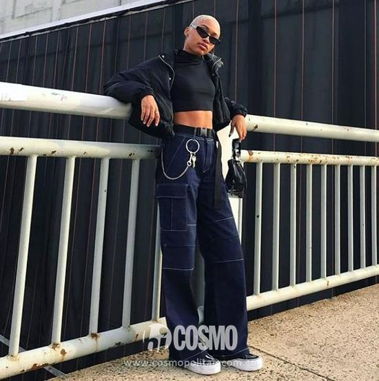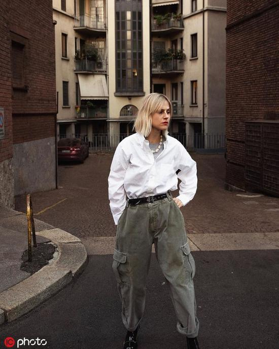 阔腿裤和老爹鞋是今年的大热门,再加上工装裤的设计,绝对是最吸睛的存在。