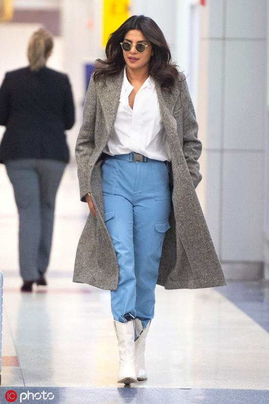 Priyanka Chopra也pick了白衬衫和同色高跟鞋,搭配蓝色紧身工装裤,帅气又清新。