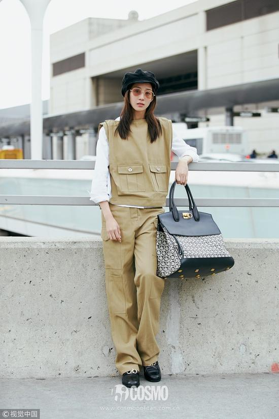 张钧甯也pick了一身卡其色工装套装。质地硬朗的阔腿工装裤搭配同色马甲,中性率性中又多了一些文艺气息。
