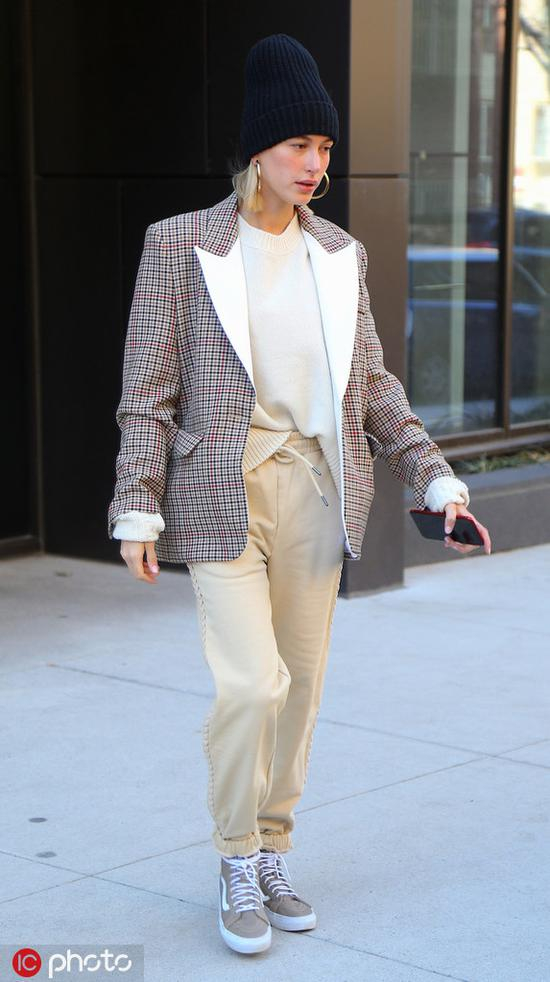 当然对不是腿精的我们来说,裤子太长就会显得腿短。这种情况就可以参考海莉把裤脚卷到八九分的位置,进一步提高束口效果来防止整体松垮。