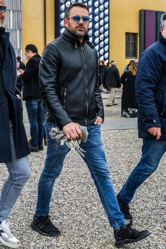 穿搭方面,下半身尽量选择修身的裤款,牛仔裤跟机车夹克可以说是完美搭配。现在这个天气可以内搭一件针织衫,虽然看上去很单薄,但把拉链拉上你会发现皮夹克的御寒能力是真的强!