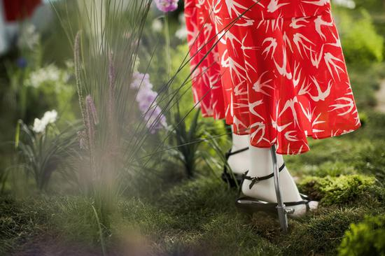 预览会的展示空间延续了创意摄影师Michal Pudelka在ochirly春季形象大片中的 “超自然空间”概念,将大自然中的鸢尾元素融入现场布景,唯美斑斓的鸢尾草甸在有限的室内空间中蓬勃生长,让人彷佛置身于春日的梦境之中,充满超现实主义的梦幻气氛。