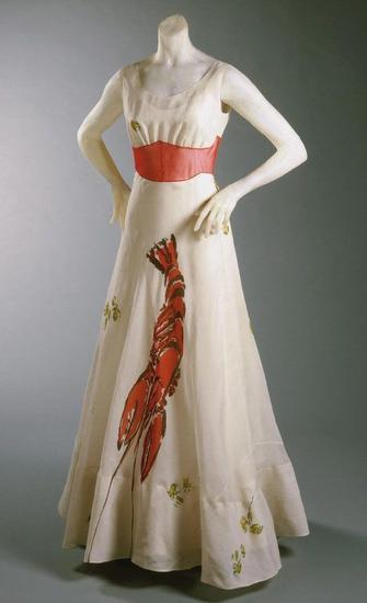 Elsa Schiaparelli也是第一个将超现实主义艺术引入时装的人,相比简洁实用直接从男人衣橱里借衣服穿,“纯粹”的香奈儿,Schiaparelli一方面有着同样的简约理想,她的衣服口号一度是“设计出适合工作的服装”,然而一转眼,她的实用主义就破功,让超现实主义画家达利在雪白裙子上画个大龙虾,她在自己严谨的工作制服上私藏了许多趣味性细节。