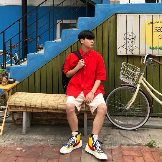 同样的鲜红色衬衫好像很难穿出门,与拼色球鞋上的红色 Swooch 呼应就顺眼很多了。(这位小哥到底有多少双 Sacai 联名?)