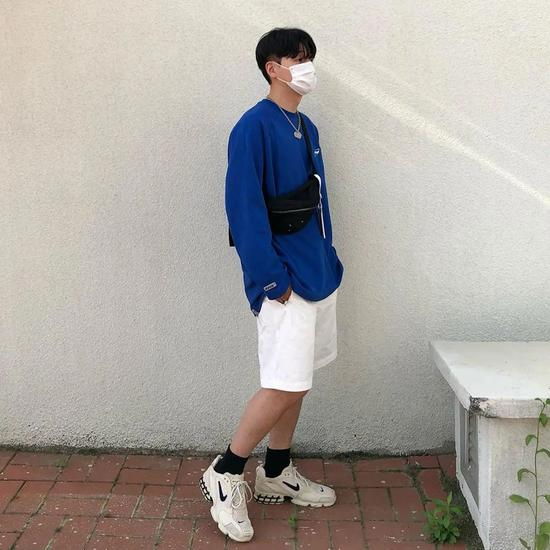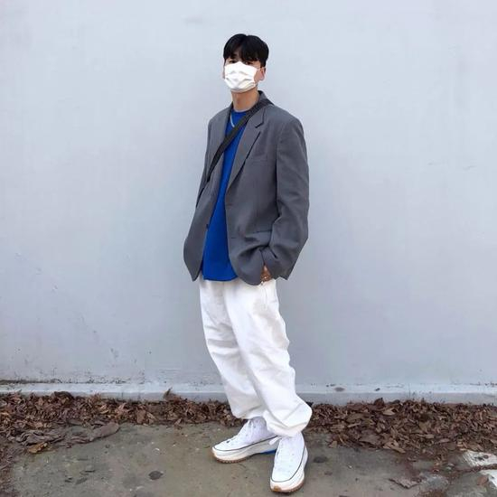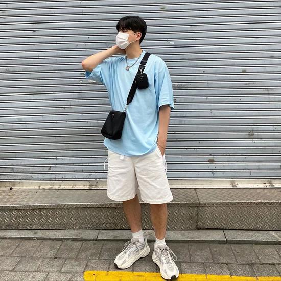 白裤子搭配一件宽松的蓝色 T 恤,少年气息扑面而来。