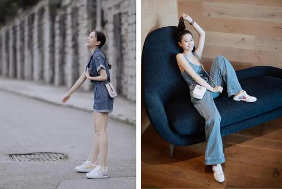 最后我再补充一句,如果是拍照的话,除了运用可以显高的搭配细节以外,找好拍摄角度同样很重要。比起双腿乖巧的并拢到一起(左图),把一条腿像右边那样稍微往前伸一点,看起来是不是更显长?光是这双大长腿亮出来,就是170cm的既视感。