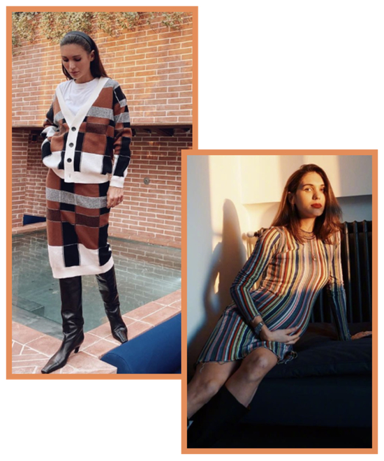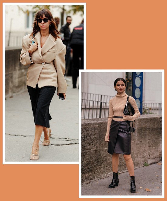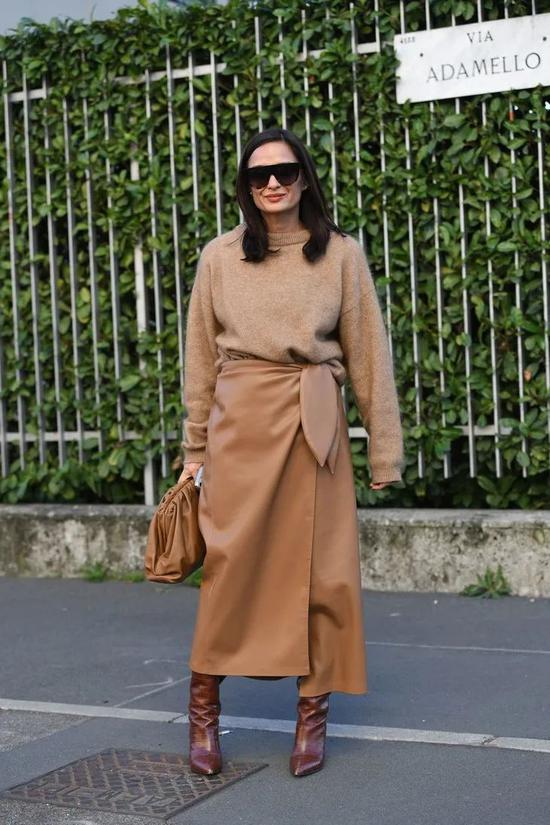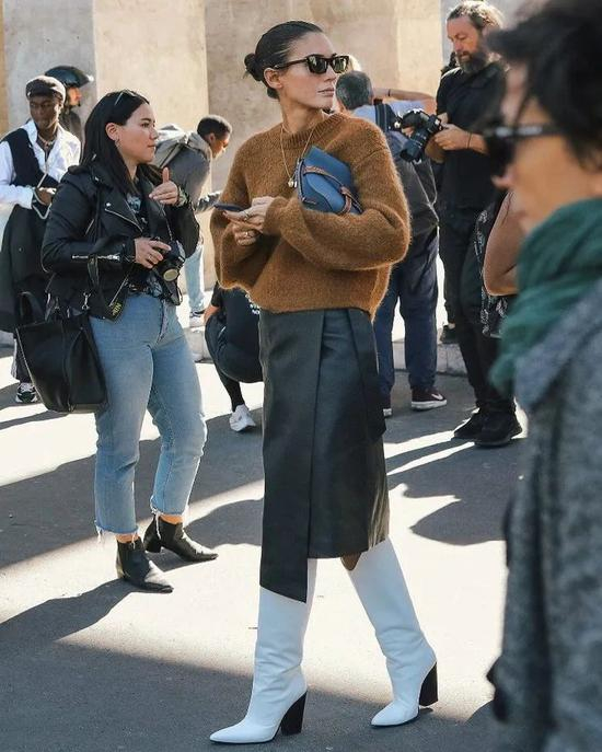 天气再冷一点还能换上质地厚重的皮裙、针织裙,完美平衡温柔、硬朗两种对立面。