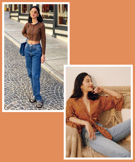 进阶版可以再加一个介于两个颜色之间的中性色来做调剂,姜黄色、焦糖色是自带复古风的最优选择,少量橘色调装饰则是增加造型感的时髦伎俩。