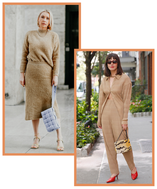 老生常谈的顺色搭配真的太好用,对于这种高级色彩更是如此。针织套装是秋天的最佳选择,担心半裙会裹出肚子小肉肉的话可以换上阔腿裤,更多一种休闲的轻便。