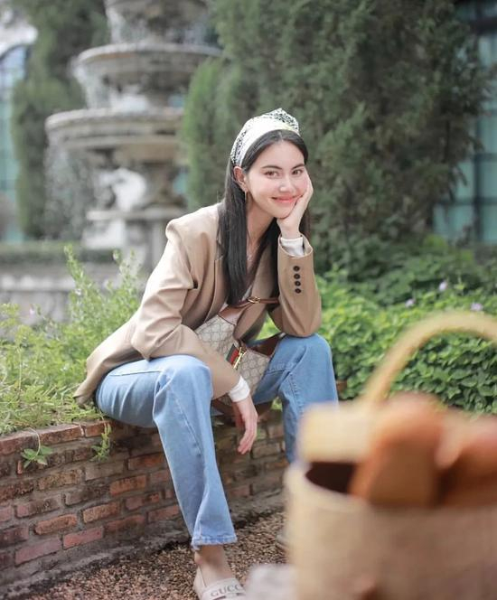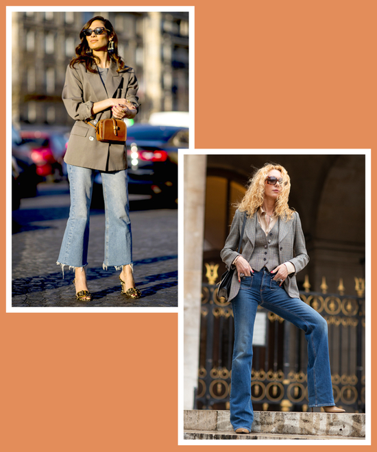 更有穿越感的搭配是把磨白质感的喇叭仔裤和帆布鞋穿在下面,像极了嬉皮士。但要说通勤,直筒裤更靠谱,可以用丝巾、金属耳环等装饰来增加职场精致度。