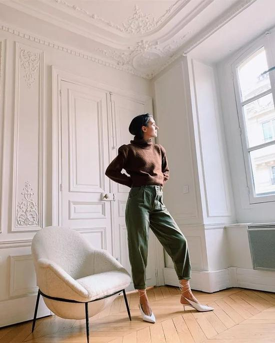 值得注意的是,绿色挑选很有讲究,偏黄、偏暗的低饱和度和砂岩褐组合更能穿出高级质感。