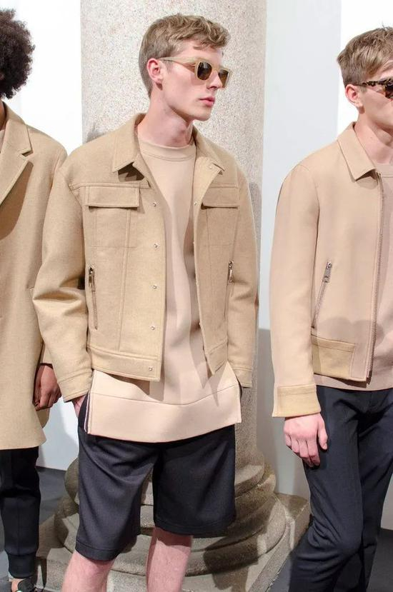 与黑白灰的极简风格不同,沙色构成的极简风基本没有什么冷淡感,而是更要粗旷和硬挺,风格有力,契合男人的自信气质,同时也强调了造型整体的线条表现,质朴起来的同时也要优雅利落。