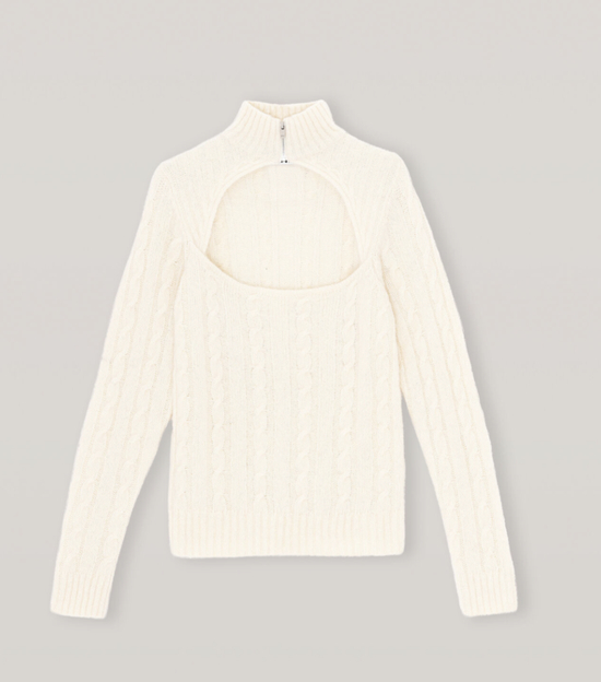 最近时装博主Reese Blutstein Po出了一张身穿Ganni胸口三角形挖空的毛衣的照片,又引领了一波潮流,经典复古的绞花织纹结合现代领口,高领处还添加了拉链设计,碰撞出时髦又俏皮的Style。