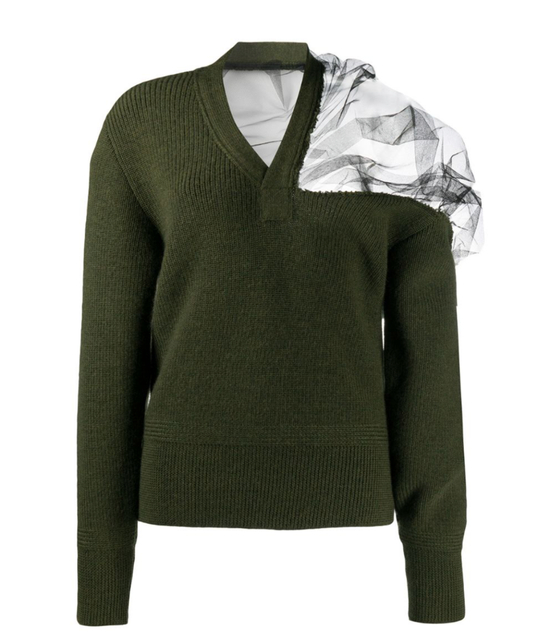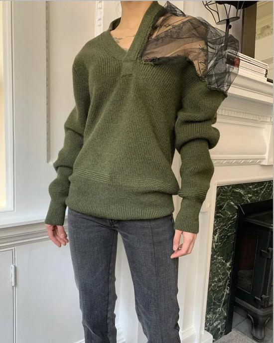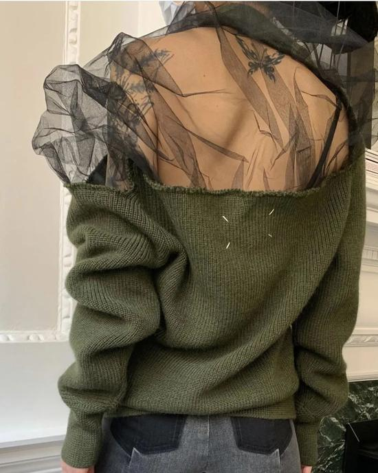 Maison Margiela 则是不忘在挖空的地方拼接不同的材质,来彰显独特的设计风格,2020秋冬新款的挖空毛衣,结合一层黑色薄纱笼罩,很有“暗黑公主”的感觉,不得不说John Galliano手下的Maison Margiela真的够绝。