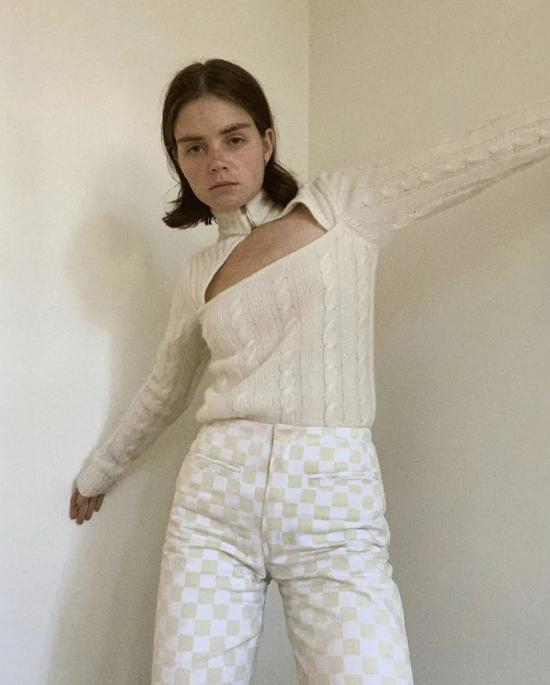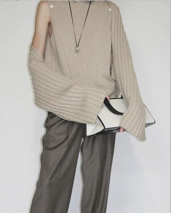说到挖肩毛衣,Peter Do在2021春夏系列推出的单边挖肩的毛衣绝对值得一提,加入不对称的结构细节,大胆地使用实验性质的轮廓,设计十分新颖潮流,酷酷的女孩都可以前来驾驭。