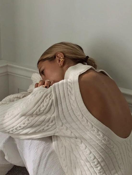 丹麦品牌Gestuz也很会,斯堪的纳维亚风情的禁欲感和大面积挖空的诱惑力在这件毛衣上平衡得刚刚好,一直以为毛衣是慵懒风的代名词,但是Gestuz的毛衣居然可以同时掌握清冷格调和性感两种气质。