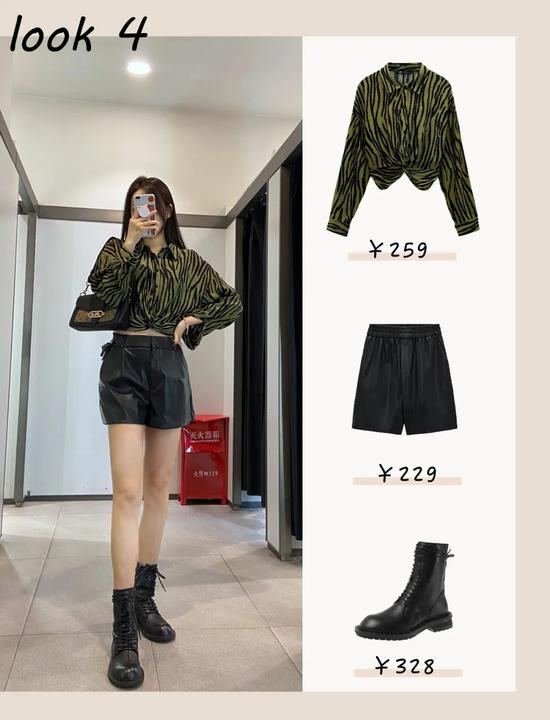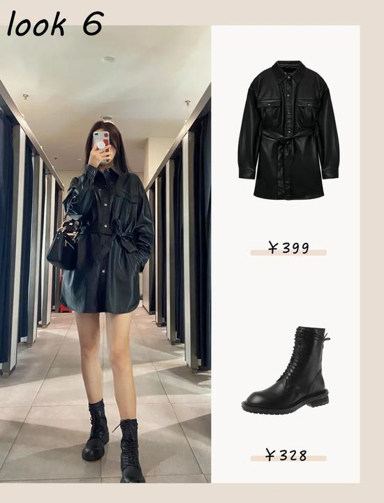 因为它是比较轻熟的款式,所以下装就搭配了中性的仿皮短裤和马丁靴,中和了严肃感又不失气场。