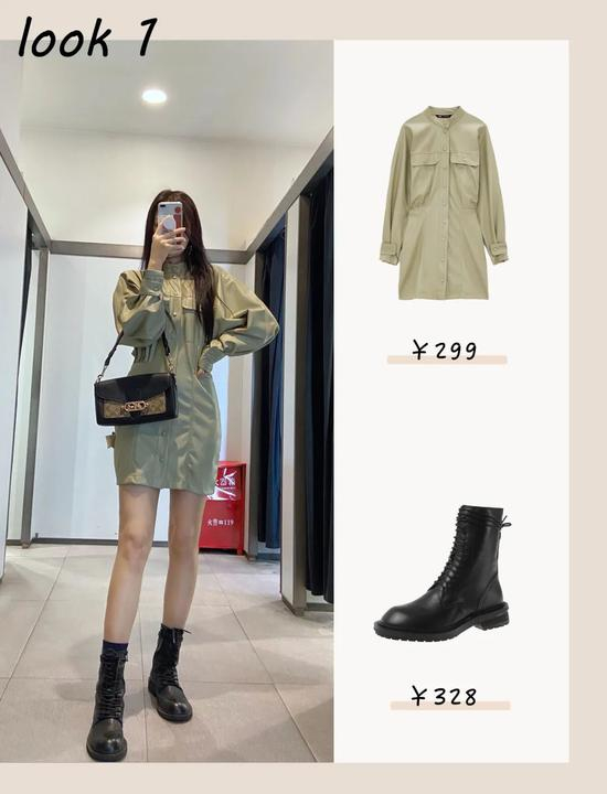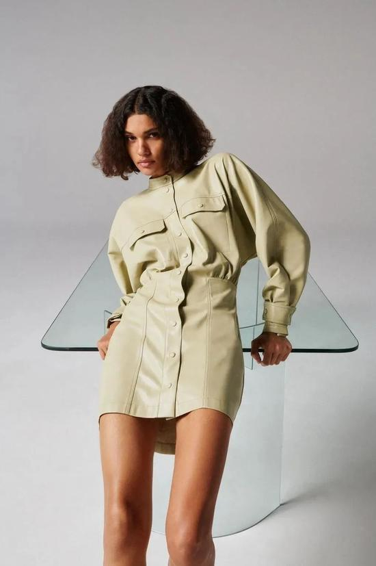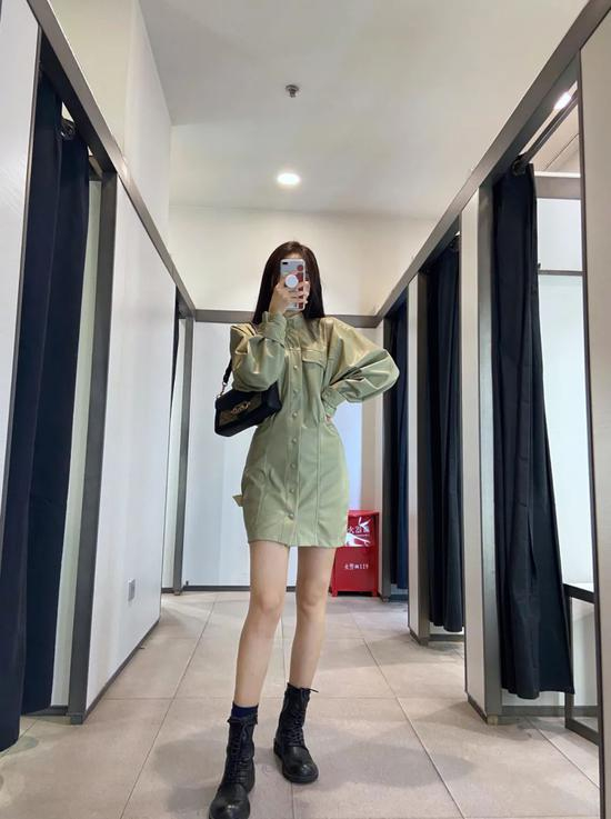 这件淡绿色仿皮连衣裙一进门就让人移不开眼,颜色清新,款式时尚没有普通皮衣的规矩板正,搭配马丁靴又甜又酷。