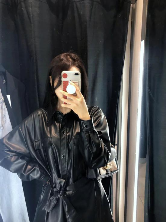 这套也是试穿效果比较好的仿皮连衣裙,比起上面的淡绿色,黑色的版型偏直筒,也稍宽松一些。