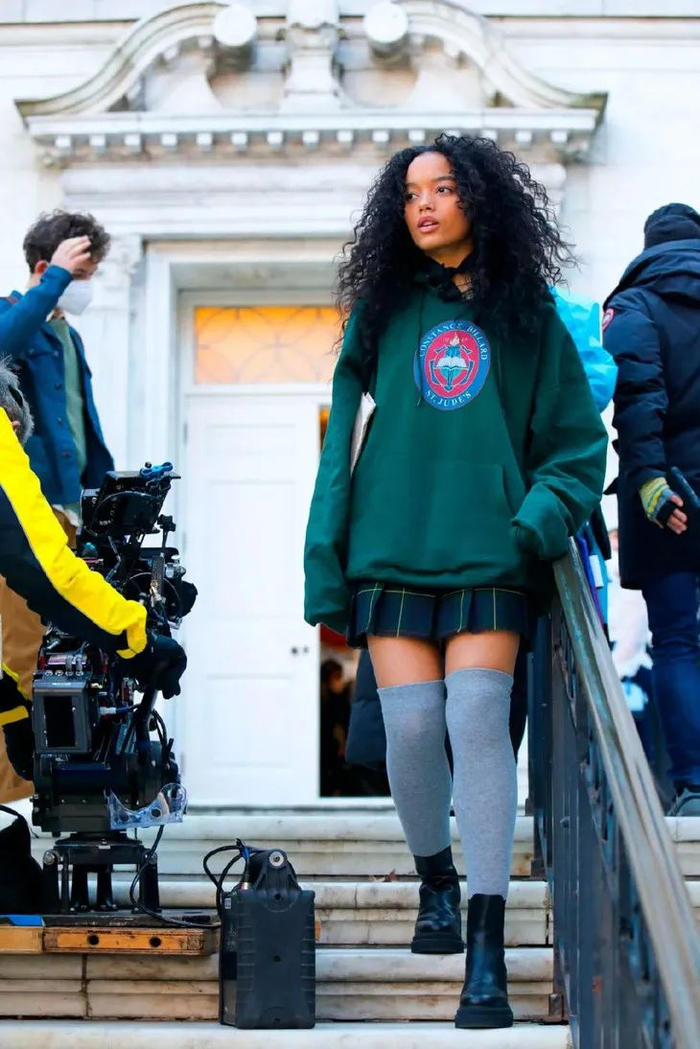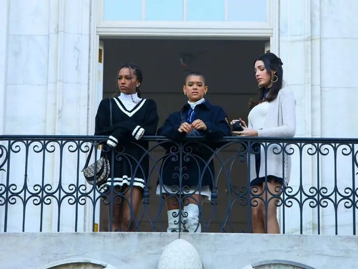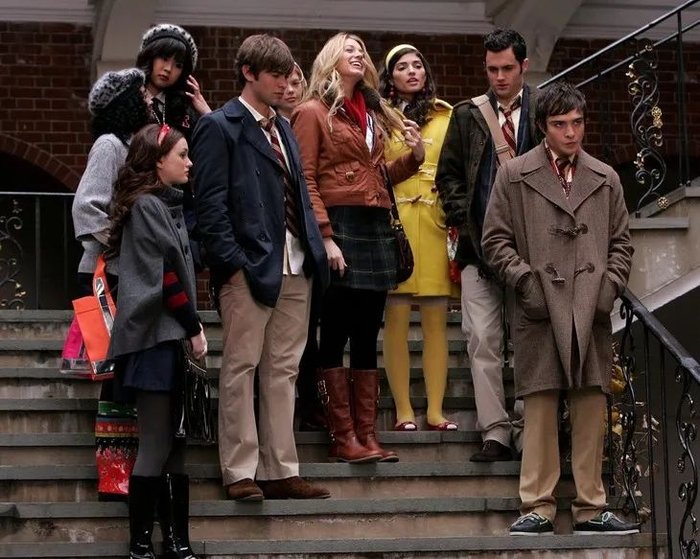 虽然同样都在gossip girl们最爱的大都会博物馆的台阶上,却褪下了原版剪裁精致的小套装,换上了学院风的卫衣和衬衫,怎么看都像是少了点曼哈顿上流阶层内味。