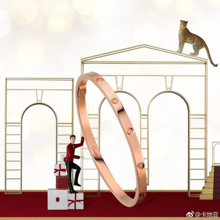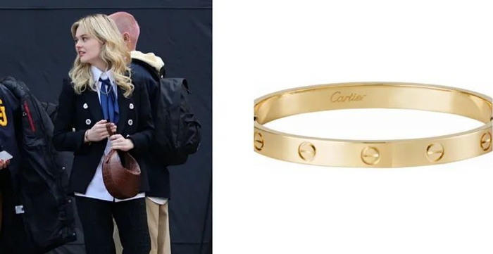 Emily手腕上的是Cartier的LOVE系列,这款镯子有着很深的情感寓意,每个镯子都配有一个螺丝刀用以佩戴和解开,象征着永恒缠绵的爱情。