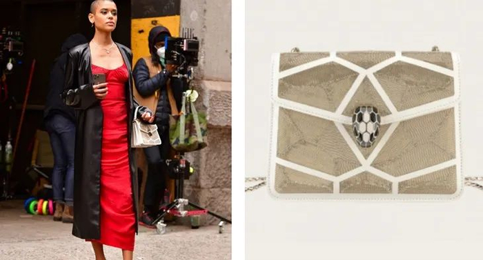 Jordan的这款包包来自宝格丽的Serpenti Forever系列。经典的蛇头造型作为纽扣被点缀在包袋上,野性而张扬。