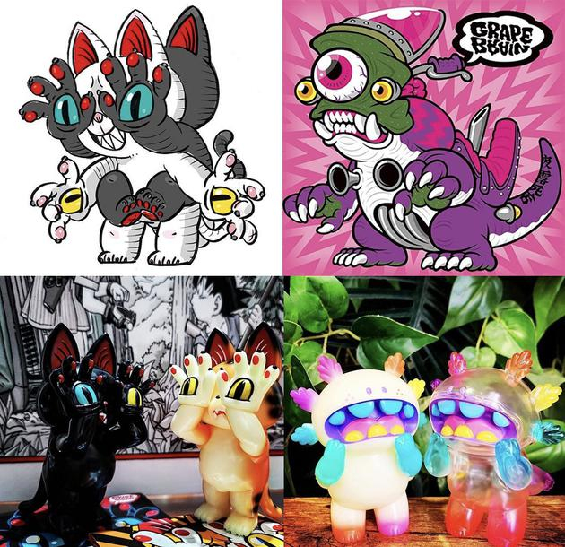 GRAPE BRAIN(葡萄脑)来自日本福冈,以“RAGE”Style为设计风格。葡萄脑是一个悖论的图形机器,除绘画外,它是一只融合了流行文化、摇滚美学、怪诞风格以及日本和西方风格的元素等创造出的奇特生物。
