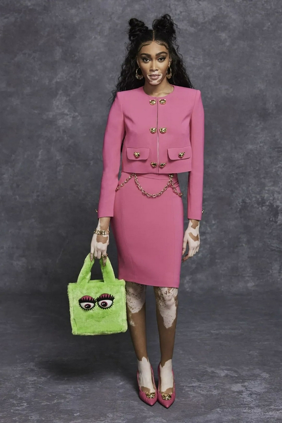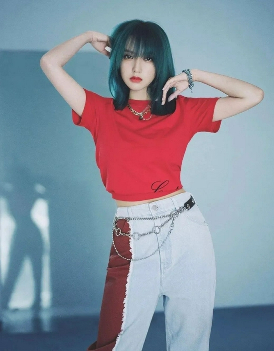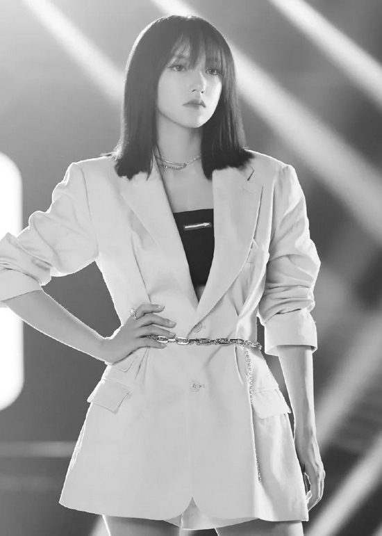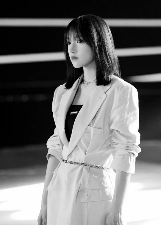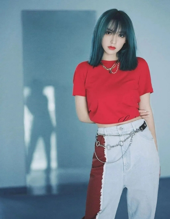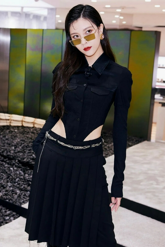 链条元素用到裤子的设计中也比较常见,吴宣仪这条三层镂空的粗链条能很好的展现出腰部线条,性感前卫又个性。