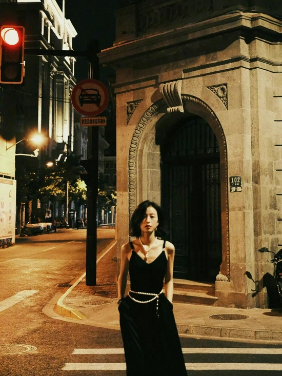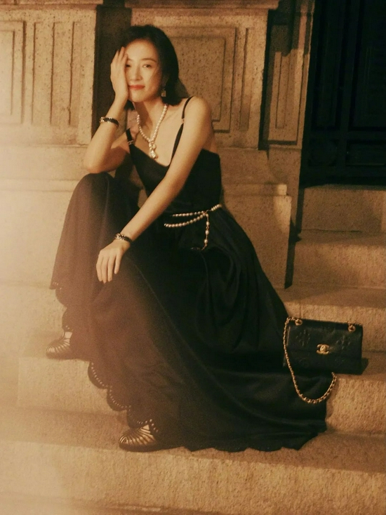 周雨彤一身简约黑色吊带长裙,搭配珍珠项链和腰链,短发红唇妆容,在暖调夜色光影映衬,更显优雅迷人。