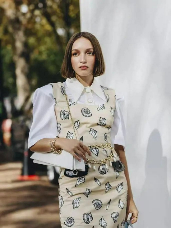 泡泡袖衬衫叠搭印花连衣裙,这种不太能凸显腰身的穿搭,需要一条腰链来救场~