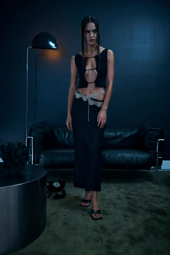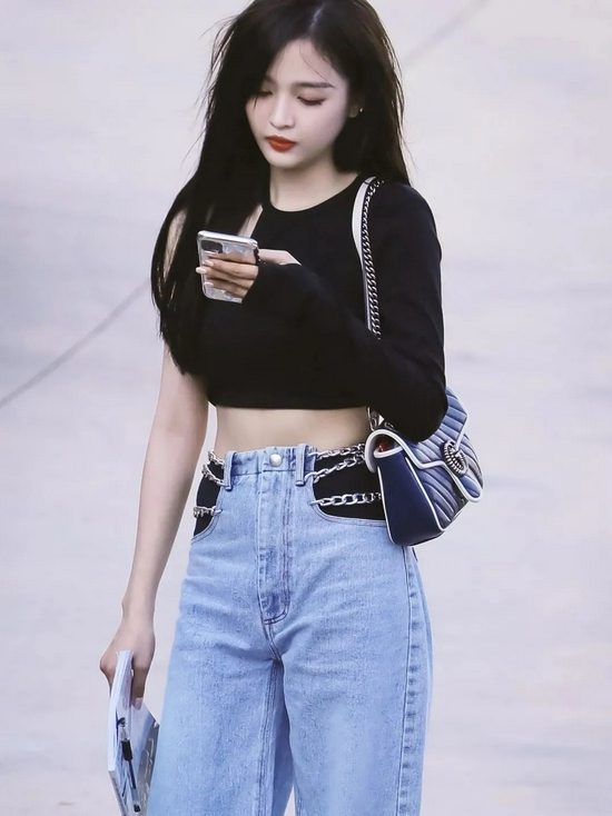 这两年特别火的翻腰牛仔裤,特别能凸显腰部线条,用腰链给空荡荡的腰部加戏,热辣性感又不失细节品味。