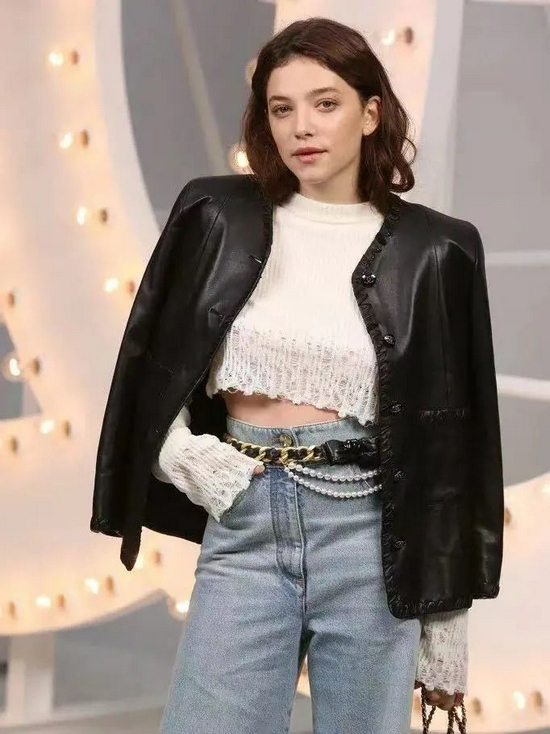 珍珠元素的腰链和腰带组合,给黑色皮衣牛仔裤的中性穿搭增加了一点柔美感。