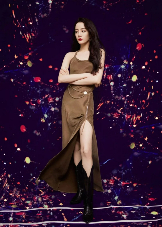 迪丽热巴一袭军绿色高开叉长裙,一条腰链随意勾勒在腰间,又美又飒。
