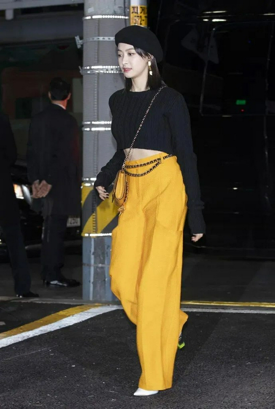 宋茜用短款上衣搭配明黄色阔腿裤,黑色链条提升腰线,胸部以下全是腿!