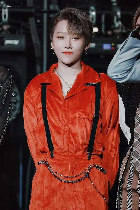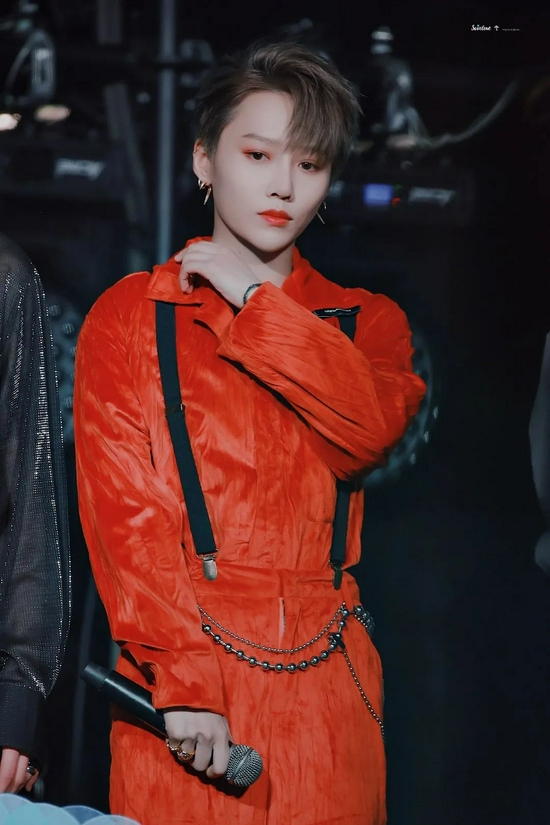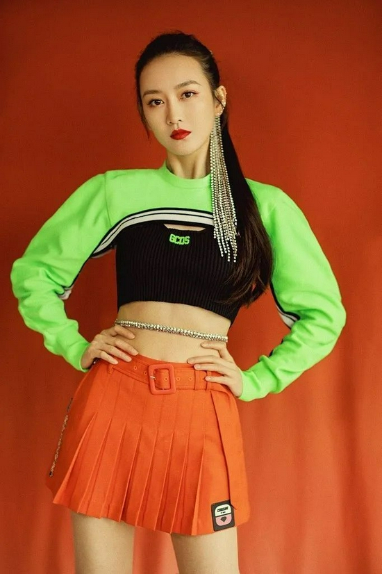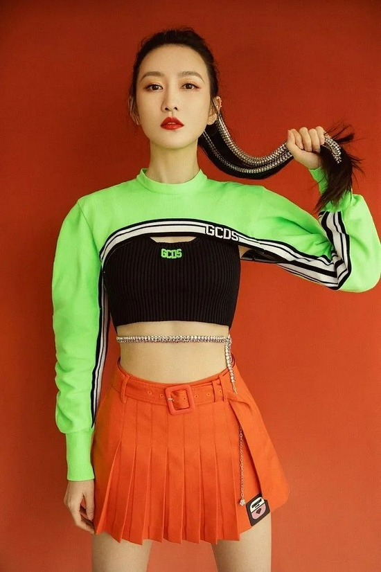 刘雨昕一身橙色工装,黑色背带与金属腰链点缀于腰间,可以有效增加唱跳舞台的韵律感。