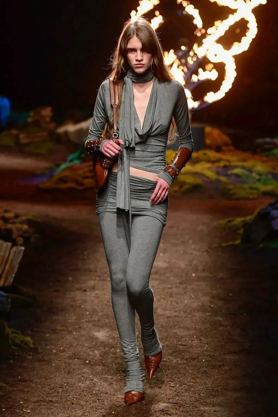 凭借Y2K风在时尚圈中越来越醒目的Blumarine在本季延续千禧年美学,在贫瘠土地上,模特们身穿垂坠感十足的黑色上衣搭配修身、弹力瑜伽裤,自然、率性的褶皱带来优雅的古典廓形,随性飘动的褶皱裙摆恣意又浪漫,在多层次的造型中发现女性大胆、自信的一面。