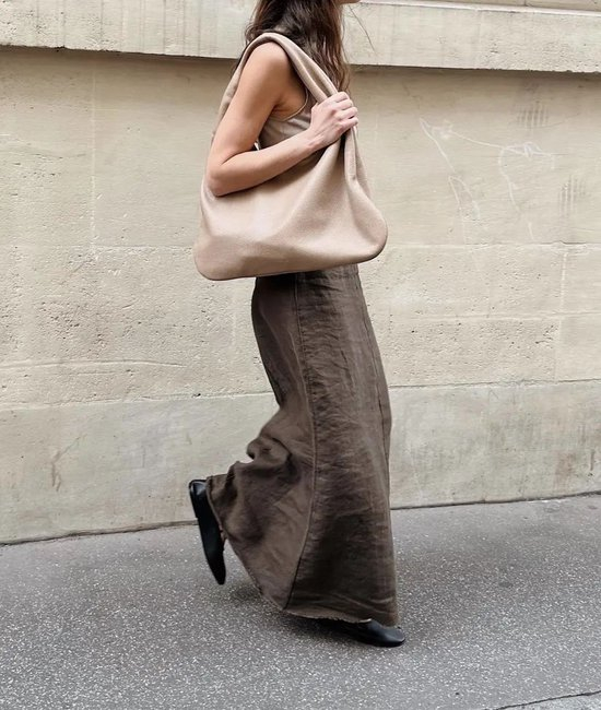 或者把能当外套穿的廓形衬衫从蓝色变成大地色吧,配一只主编前一段给大家种草的皮+帆布包,这一身就很“老钱”了。