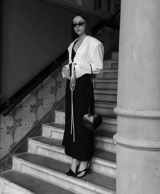 短外套搭配连衣裙,利落有了,气场自然随之而来。露出脚踝的高跟鞋给造型增加了轻盈的感觉,并且能够延伸小腿的长度。