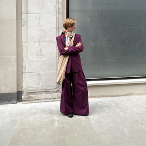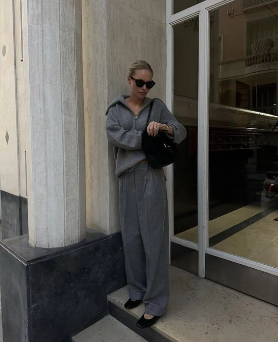双倍效果版本,是在高腰线的基础上,再露出纤细的脚踝。这招不难,给阔腿裤挽个边就能完成,时髦和层次感也都来了。
