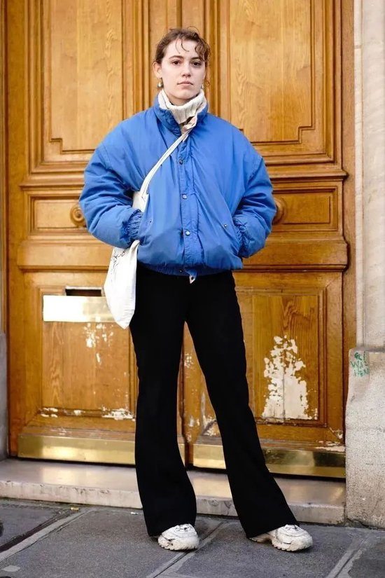 休闲一些的话,可以搭配工装裤或leggings,纽约博主rubylyn的蓝色短羽绒服+工装裤搭配,保暖时髦带着满满的美式复古。相较保守永不出错的基础色,想要不费力完成更高时髦度,可以选择一款彩色羽绒服,自成亮点。