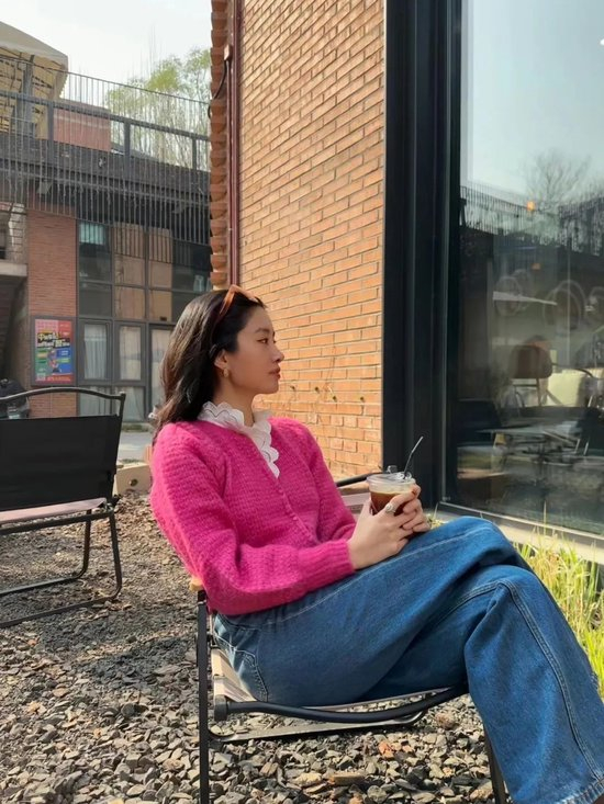 除了毛毛外套,各式各样的针织衫也是杨采钰的冬日必备。最经典也最好搭的一定要数纯色款式。简单大方的纯色款随便配条牛仔裤就能应付大多数场景。