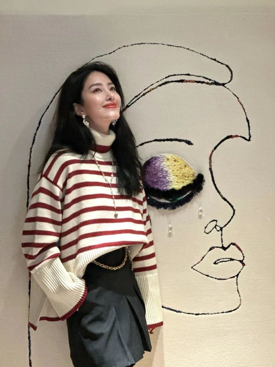 偶尔选择条纹来点亮衣橱也是不错的选择。杨采钰这种白色和红色条纹很经典,搭配黑色短裙和金色配饰,把法式那种舒适时髦表达出来了。