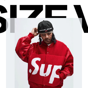其中这件主打的经典 Supreme 红白配色的棒球夹克还是很有街头味道的,看这个字体风格,应该又是熟悉的 CPFM 合作了?另外大铆钉的皮衣夹克也算本季的顶级单品了,至少羊皮的材质质感应该还是可以的~