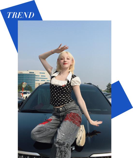 Polo领不但自带复古属性,也很适合与其他风格的单品进行碰撞,打造既怀旧又新潮的个性造型。宋雨琦上身的这件Polo衫短袖,衣领外翻呈U形张开,轻松打破传统Polo的拘谨感,微微蓬起的袖型增添甜美气息,外搭一件黑色波点小衫,既层次分明又俏皮可爱。