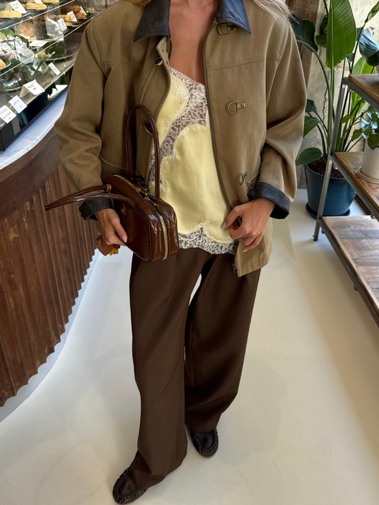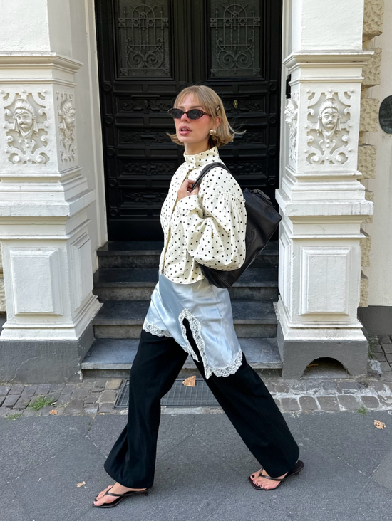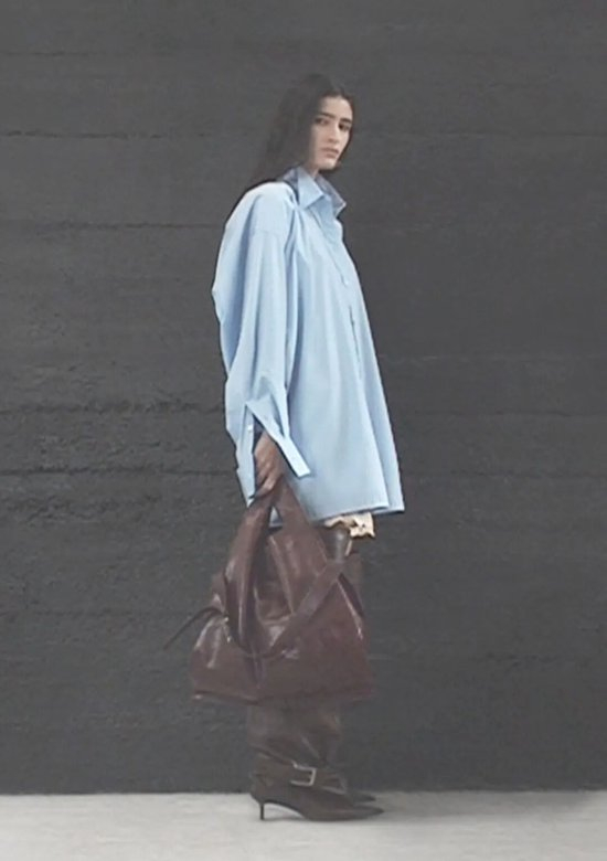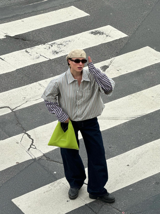 失序感穿搭中,材质特别的基础款也可以成为灵感单品。比如自带高级感的丝绸衬衫,与粗糙材质形成鲜明对比;硬朗外套与卫衣的松弛形成有趣对比,打破常规材质组合。